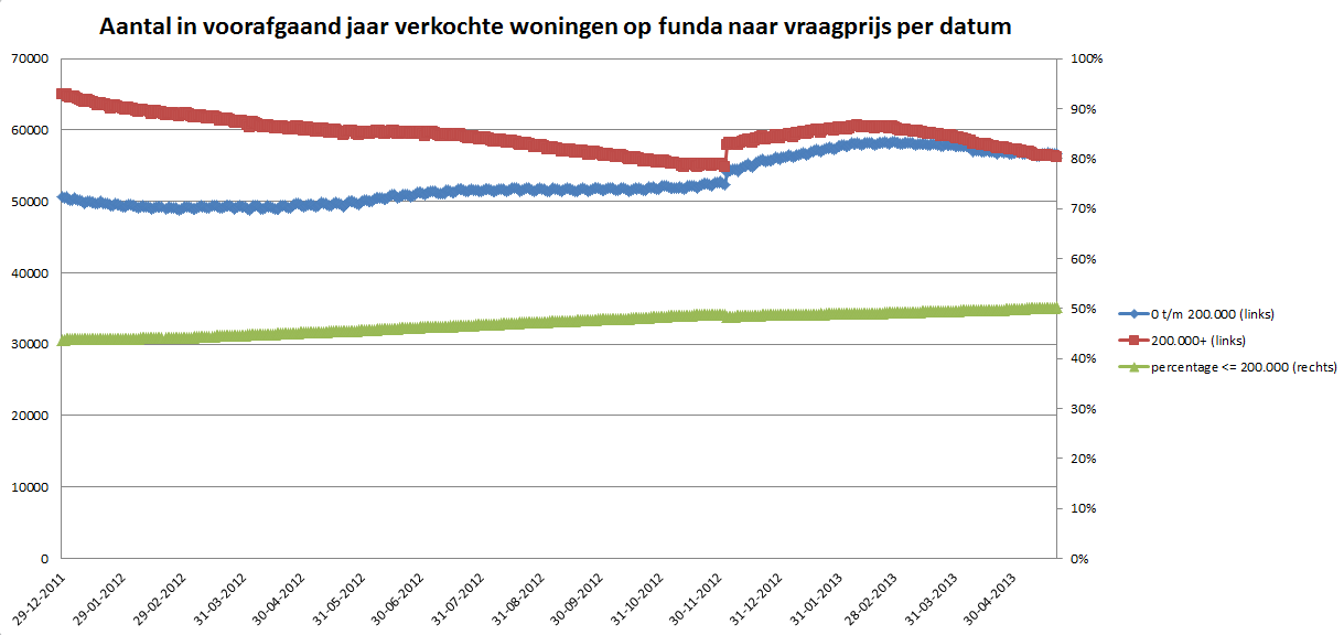Even een grafiekje tussendoor, van het aantal verkochte woningen op funda zoals je die ook zelf op deze site kunt opvragen in absolute aantallen of geïndexeerd. Alleen nu gegroepeerd naar ‘tot en met twee ton’ en ‘vanaf twee ton’. Dit gaat om VRAAGprijzen uiteraard. Zoals je ziet is het inmiddels fifty-fifty (klik voor groot):